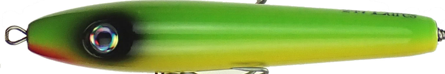 Unlike those plastic spook-style lures on the market, the 247 Lures Mully is designed to make a big commotion on the water. When floating at rest, the Mully will bob vertically at the water’s surface, with the nose pointing up. As you retrieve line, the Mully will splash side to side as well as up and down. Vary the speed of your retrieve slightly, and you can make the Mully glide quietly side to side, or make it splash and throw a serious wake.